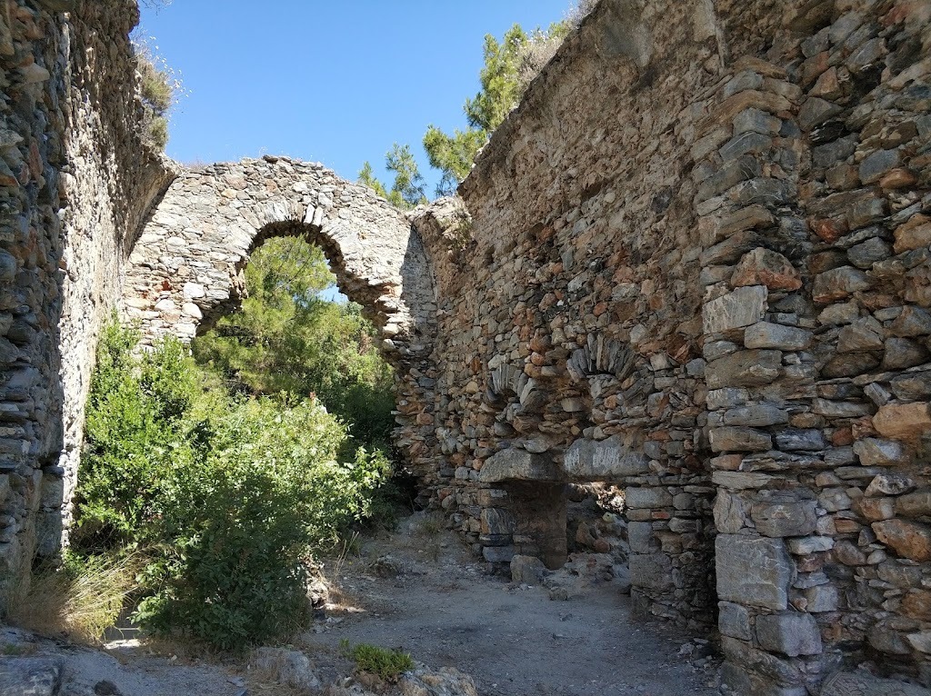 🔸Akropolün doğusunda bulunan koyda, dikdörtgen planlı bir bazilika ve içerisinde yazıtlı fresk nedeniyle Hagios Georgios Stratelates’e atfedilen tek nefli küçük bir kilise görülebilmektedir. Aynı alan içerisinde bir de hamam kalıntısı bulunmakta olup, hamam plan bakımından bölgenin diğer hamamları ile benzerlik göstermektedir.