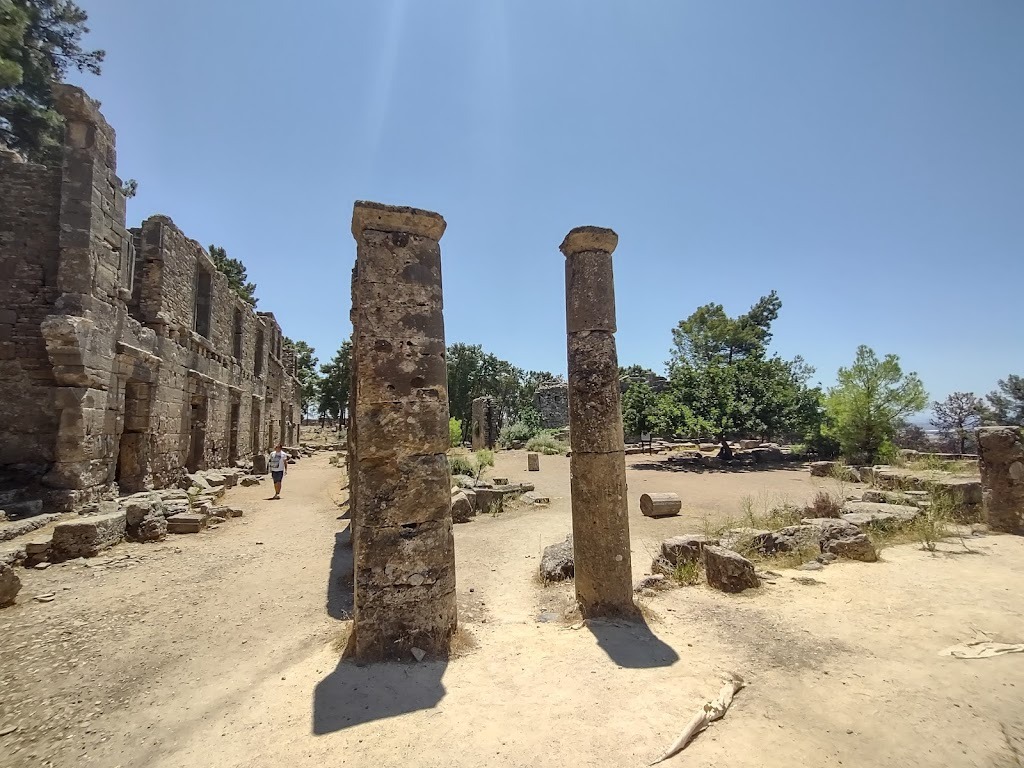 🔸Kentte bugün görülebilen kalıntılar Helenistik, Roma ve Bizans dönemlerine aittir. Bunlar arasında sur duvarları, Pamfilya bölgesinin en iyi korunmuş agorası; hamam, tapınaklar, sarnıçlar, kilise ve mezar yapıları yer almaktadır.